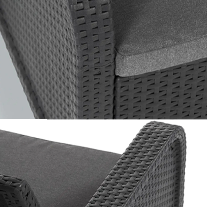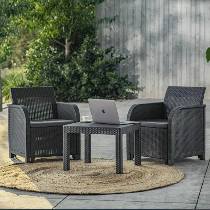Opis - Balkonski set Rosalie grafit Keter CU 249588Balkonski set Rosalie grafit Keter CU 249588 u elegantnoj grafitno-sivoj boji savršen je izbor za opuštanje na terasi, balkonu ili u dvorištu. Set se sastoji od dve udobne fotelje i klasičnog stočića, izrađenih od visokokvalitetnog PE ratana, otpornog na UV zrake i vremenske uslove. U paketu dolaze i jastuci od Polikotona, pružajući dodatnu udobnost. Zahvaljujući Click n Go sistemu montaže, sklapanje je brzo i jednostavno, dok lako održavanje omogućava dugotrajan i besprekoran izgled. Ovaj set je idealan spoj funkcionalnosti, komfora i modernog dizajna.