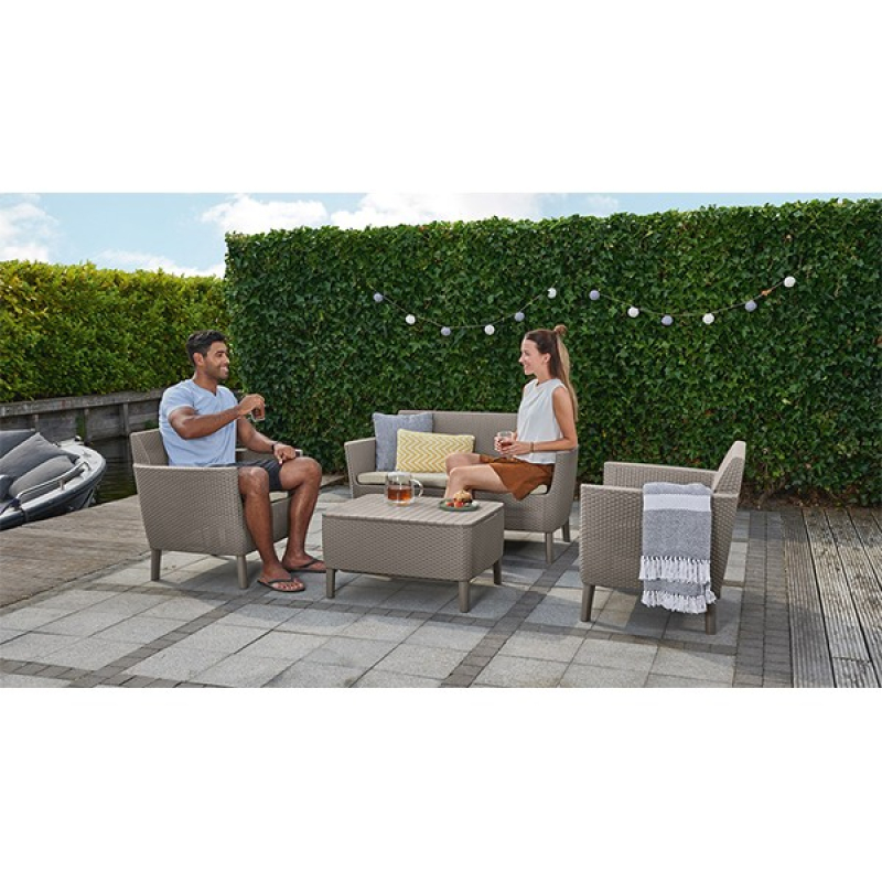 Opis - Baštenska garnitura Salemo Kapućino Curver CU 253221Baštenska garnitura Salemo Kapućino Curver CU 25322 idealan je izbor za sve koji žele udobnost i eleganciju u svom eksterijeru. Set sadrži dve fotelje, dvosed i box sto sa prostorom za odlaganje, upotpunjene udobnim jastucima za sedenje. Izrađen od visokokvalitetne plastike, sa teksturom ratana u atraktivnoj svetlo braon boji, koja setu daje dozu elegancije i raskoši. Set je otporan na UV zrake i vremenske uslove, što garantuje dugotrajnu postojanost bez oštećenja. Montaža je brza i jednostavna, a održavanje je lako i praktično, pa ostaje više vremena za uživanje u lepom vremenu. Ovaj set pruža savršen balans izdržljivosti, komfora i modernog dizajna za svaki baštu ili terasu.