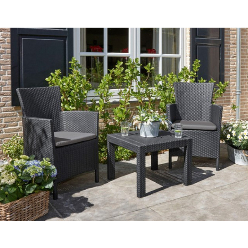Opis - Baštenski set Rosario grafit CU 216777Baštenski set Rosario grafit CU 216777 je set kompaktnih dimenzija, idealan za uređenje balkona ili manjeg vrta. Set se sastoji od dve fotelje i kvadratnog stočića idealnog za odlaganje osvežavajućeg napitka. Fotelje su ergonomski oblikovane, sa udobnim naslonima za ruke i leđa. Garnitura je napravljena sa reljefnom površinom koja svojim izgledom asocira na prirodnu teksturu ratana, pa je ova set istovremeno i vrlo dekorativan. Jednostavno se sastavlja, a zatim i održava. Baštenski set je izrađen od Polipropilena koji je otporan na vremenske uslove i UV zrake.